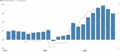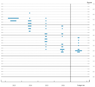 The above chart shows that the Fed board members are expecting cash rates to drop from their current 15-year high, back towards a more ‘neutral’ position. The median expectation for 2024 is 5%, which is expected to drop to 4% in 2025. The long-term median of 2.5% seems to suggest that US central bankers have this rate in mind as a long-term benchmark.